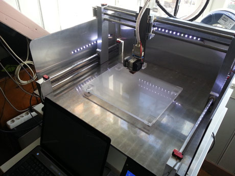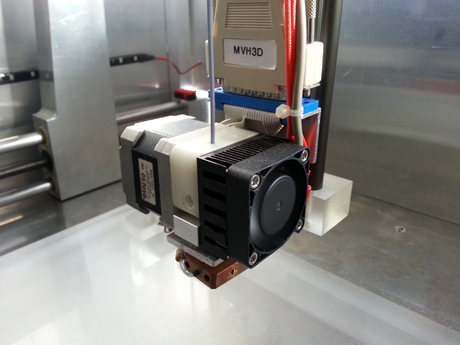 Dit betekent dat het softwarepakket verder beschreven en getest kan worden. Om de objecten (printmodellen) te kunnen printen is een kunststof bed gemaakt waarop het filament gesmolten kan worden. Dit bed geeft een stabiele en vlakke ondergrond die in ons geval niet verwarmd is. In de toekomst zal blijken of dit aangepast moet worden naar een heated bed waardoor kromtrekken van objecten vermeden kan worden. Deze aanpassing is klein en kan snel gerealiseerd worden. De printkop die als doel heeft het filament te smelten en uit te persen is gereed en getest. Het verwarmingselement dat oorspronkelijk geplaatst is had te weinig vermogen waardoor het juiste smeltpunt niet bereikt werd. Deze is vervangen door een 40W element en voldoet nu prima. Extra geforceerde koeling onder de printerkop is aangebracht