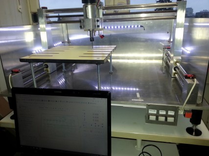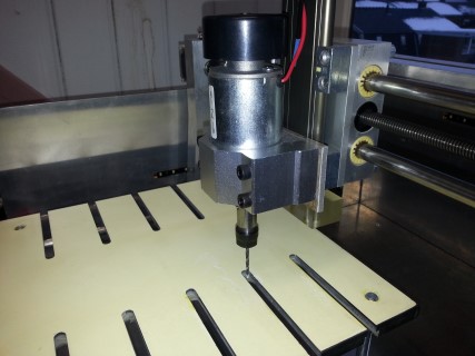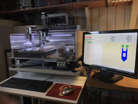 Er is ook een stabiele spindel aangeschaft waarin de freesjes vastgezet worden. Door Marius is een tableau gemaakt om werkstukken op vast te zetten. Dat is nodig om de fijne bewerkingen goed te laten verlopen. Al deze componenten zijn uitgericht om een zo’n nauwkeurig mogelijke afstelling te kunnen maken.  De CNC machine is omgebouwd en de testen voor de besturing zijn in volle gang. De eerste printplaten zijn al gemaakt en het is nu zover om puntjes op de I te zetten. De nauwkeurigheid van het frezen is 1 micron of wel 0,001 mm. Deze nauwkeurigheid is nodig om hele fijne printsporen te kunnen maken. De frees kan in snelheid geregeld worden om zo verschillende materialen zoals hout, kunststof of staal te kunnen bewerken.