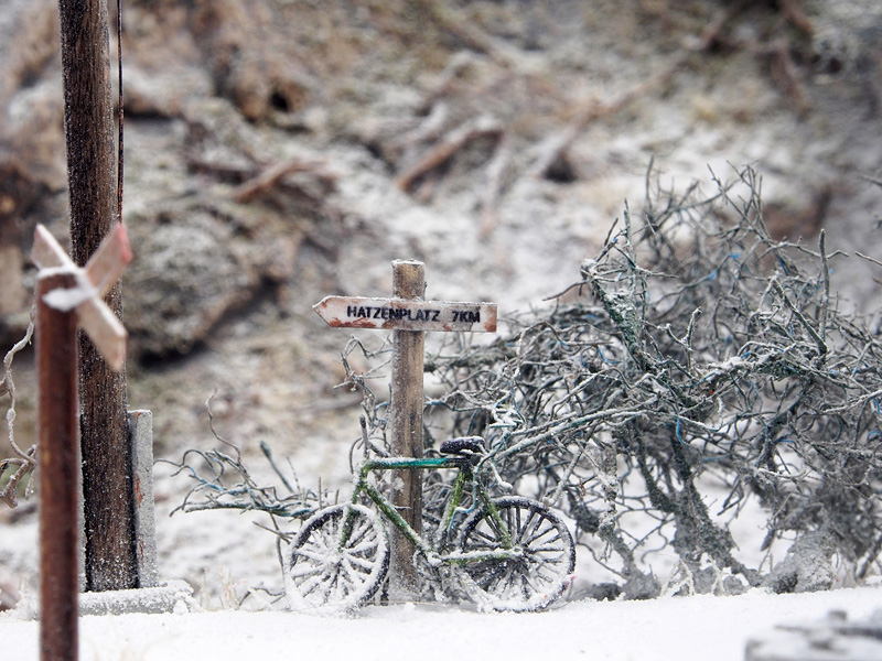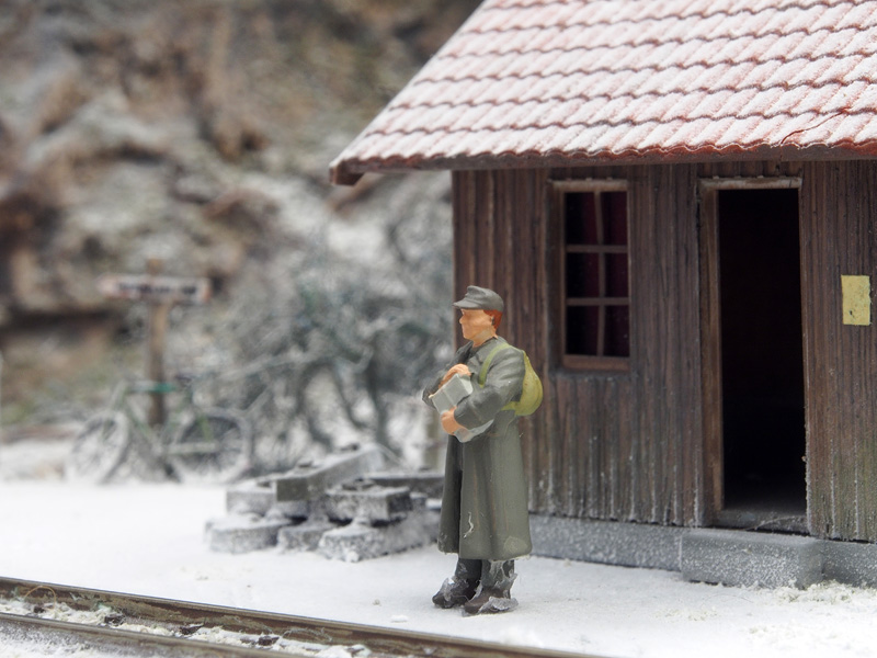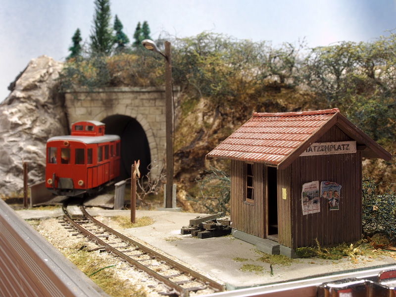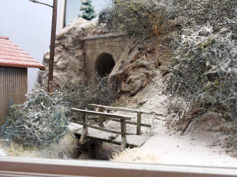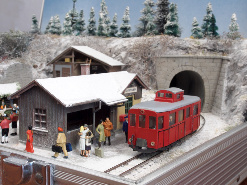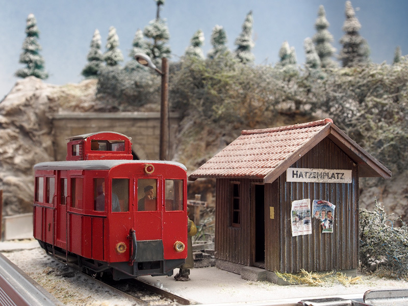 De baan zelf bestaat dus uit twee stationnetjes: Hatzenplatz (verlaten halte langs een bergbeek, 7km van het gelijknamige dorpje, een eenzame reiziger wacht op de trein) en Gutenstuben (gezellig dorpje waar net een kerstmarkt plaatsvindt. Er lopen zelfs wat bekendheden rond). Met piepschuim werd het landschap vormgegeven, met een laag gips werden de rotswanden nagemaakt. Hoewel er uiteindelijk sneeuw zou komen te liggen, werd toch eerst hele landschap, incl. grondbedekking en gras aangekleed. Daarna werd pas de sneeuw aangebracht. De sneeuw is van Precision Ice and Snow, dat wordt aangebracht in dunne lagen met haarlak. De tunnelingangen werden gemaakt van foamboard. Het haltegebouw en de kerststal zijn eigenbouw, de kraam is van Noch, voor het stationsgebouw Gutenstuben is uitgegaan van een bouwpakketje van Auhagen.