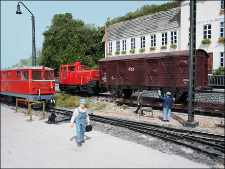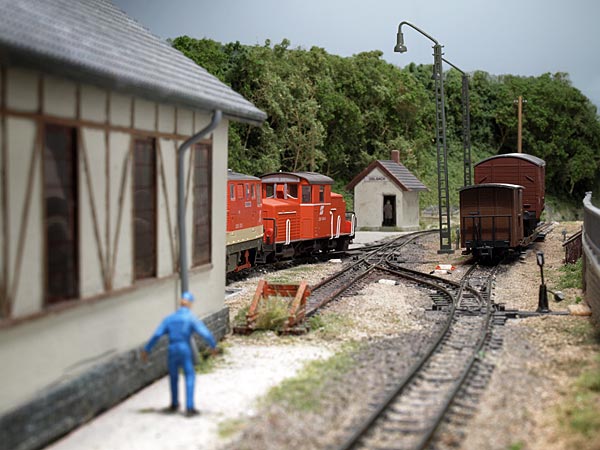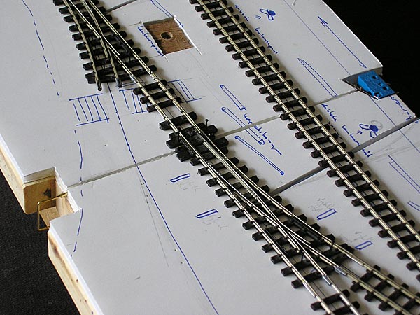 Van zwart foamboard heb ik met behulp van een passepartoutsnijder een soort fiddle yard met losse ‘cassettes’ geknutseld. De treinen verdwijnen achter de locloods door een gat in de achtergrond op zo’n cassette. Elektrische en mechanische koppeling verloopt via aan de rail gesoldeerde messing profieltjes. Er wordt gereden met een doodgewone trafo. Tijdens de modelspoorshow in het Smalspoormuseum in Valkenburg is me meerdere keren gevraagd of ik misschien iets tussen de trafo en de baan had geschakeld, maar de goede rijeigenschappen van de locs en schone spoorstaven zijn het enige ‘geheim’.