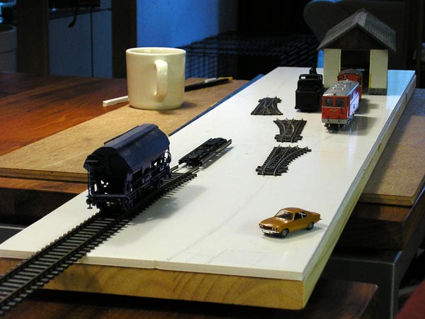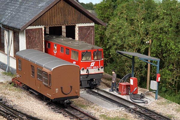 Het spoorplan werd tot een heel klein fragment van het origineel teruggebracht. Op een stuk foamboard van 20 x 100cm werd het ontwerp uitgemeten, waarbij er rekening mee werd gehouden dat met meerdere locs gemanoeuvreerd kon worden. Dankzij de korte Peco 009-wissels paste het allemaal precies. In plaats van de lelijke tweesporige locloods van Gmünd werd gekozen voor het eensporige ‘Heizhaus’ dat onder andere in Gross Gerungs (Waldviertelbahn) en Ruprechtshofen (aan de zijlijn van de Mariazellerbahn) te vinden is. Die loods had ik al gebouwd, maar voor deze baan moest ik een stuk van het woonhuis afzagen. De dieselpomp voor de loods in Gmünd is een beetje saai, dus daarom bouwde ik de versie van Obergrafendorf (Mariazellerbahn) na.