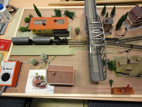 Daarna volgde de verdere aankleding met een stationsgebouw, een brug over het spoor (ook een vereiste), wat huisjes, bomen en een groene grasmat. Voor het opbergen van het rollend materieel werd op één hoek een trommeltje bevestigd. Toen ik achteraf het animatiefilmpje op youtube (zie de link hierboven) bekeek en vergeleek met mijn uitwerking, bleek ons werk griezelig veel te lijken op wat daarin wordt getoond.