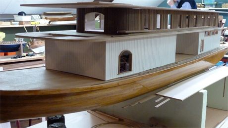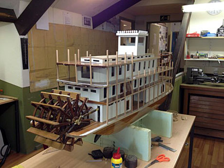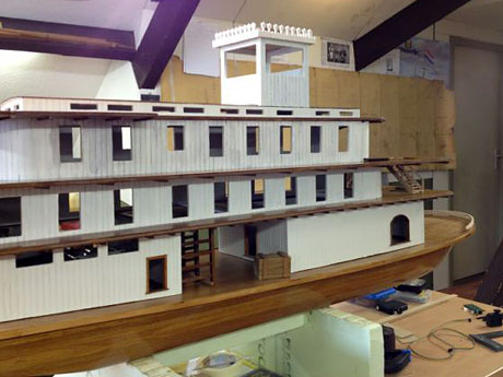 Op de foto's lijkt het alsof deze raderboot al bijna gereed is, echter voor de modelbouwer begint nu pas het fijne werk. De afwerking van de boot met alle accessoires zoals trappen, relingen, tuigage, verlichting en elektronica moet nog beginnen. Alle compartimenten en opbouw zijn gereed. Door Cor Keller zijn de wanden geschilderd en de dekken in de waterdichte lak gezet. En kortgeleden is een nieuwe jonge botenbouwer bij het team gekomen: Stan Vermeulen, een meubelmaker in opleiding. Als dat geen welkome uitbreiding is op het juiste moment!